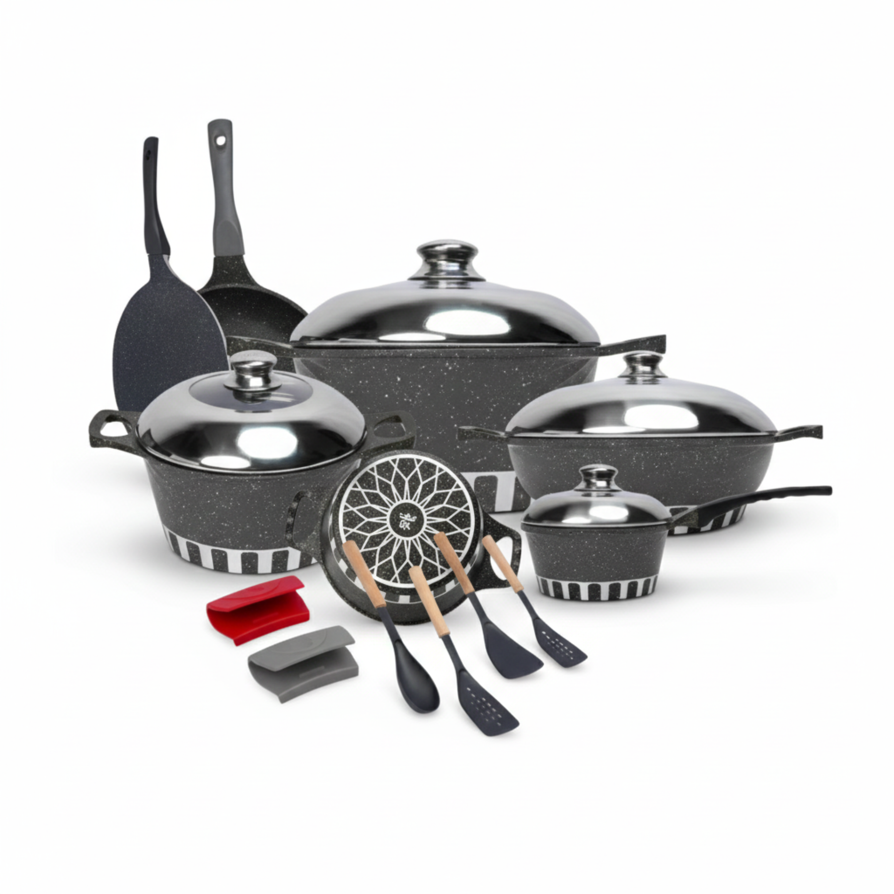 The Stela Gift Set Die-Cast Cookware Set is where tradition meets modern cooking innovation. Made with heavy-duty die-cast aluminum, this set offers exceptional strength, long life, and smooth, even heat distribution so every meal cooks perfectly from the inside out. The food grade interior ensures safe, healthy, low-oil cooking, while the sleek exterior gives your kitchen a modern, aesthetic touch.